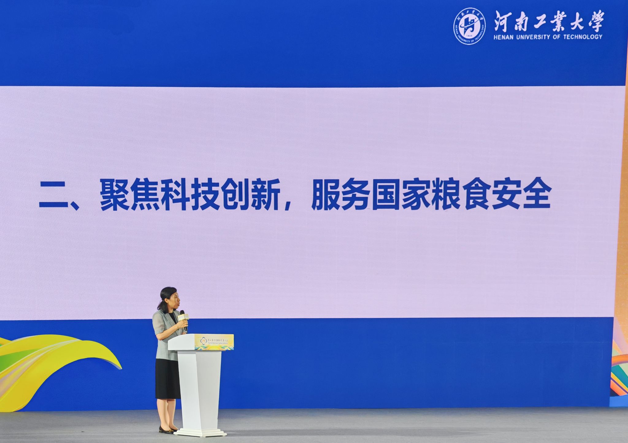 大会期间,我校在院校人才成果展区搭建了展位,集中展示了我校近年来在人才培养及科研成果产出等方面的突出成果,对我校小麦粉适度加工技术、植物蛋白深加工技术及智能化粮情监控系统的最新成果产业化落地情况进行了实物宣介。刘焕鑫局长专程到访我校展区,听取了我校关于粮食科技创新及科研成果转化的相关汇报,对学校在服务粮食行业科技进步方面取得的成绩给予高度评价,并对学校未来的发展和重点研究领域提出了指导意见。