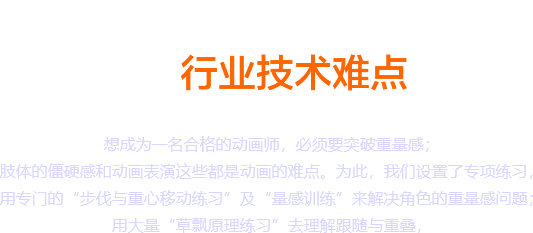 想成为一名合格的动画师,必须要突破重量感;肢体的僵硬感和动画表演这些都是动画的难点。为此,我们设置了专项练习,用专门的“步伐与重心移动练习”及“量感训练”来解决角色的重量感问题;用大量“草飘原理练习”去理解跟随与重叠,解决动画中的肢体僵硬等问题。
